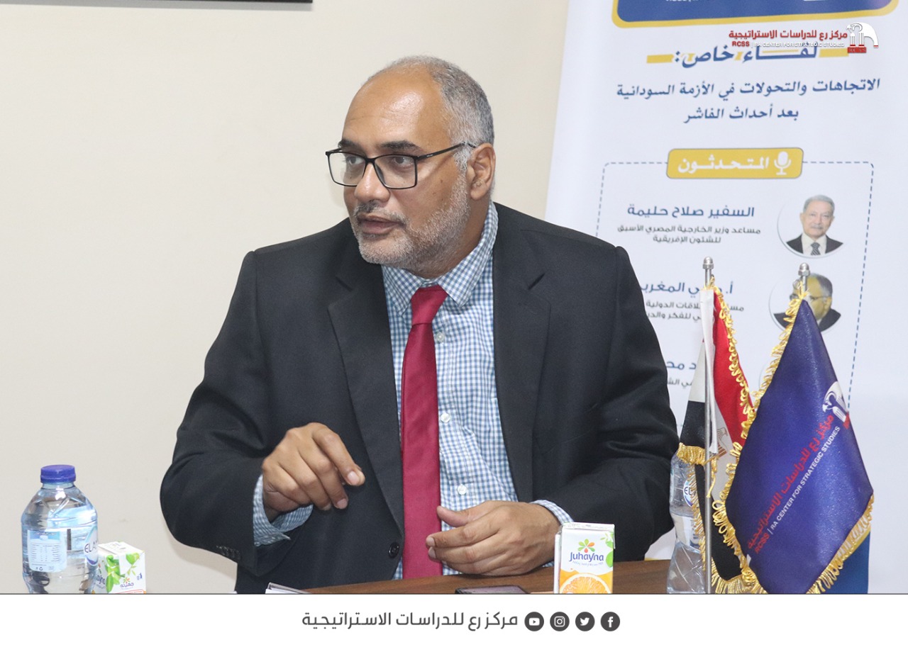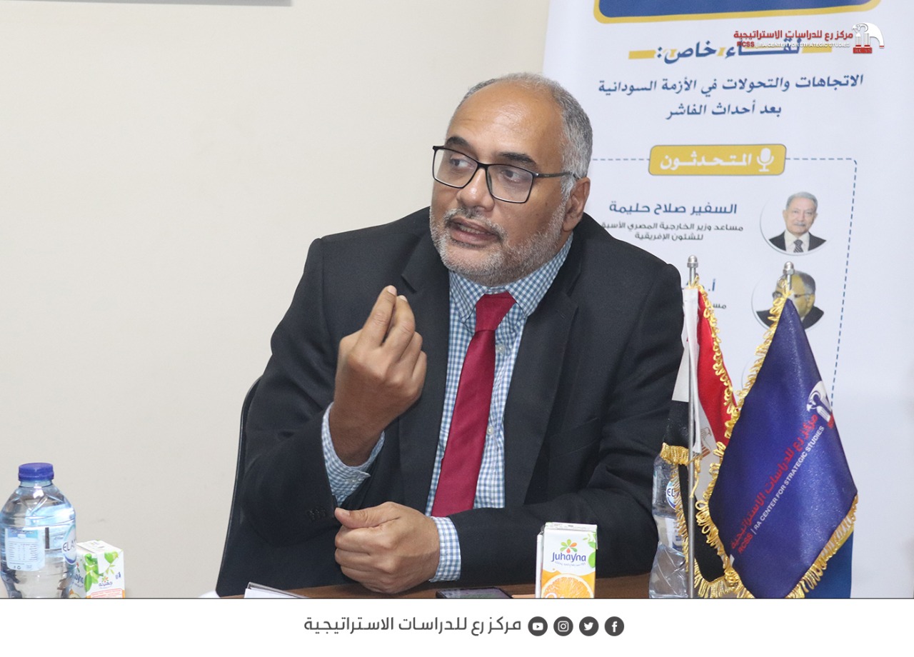 من جانبه استعرض السفير صلاح حليمة في نقاط موجزة أهمية السودان كدولة شقيقة تجمعها بمصر علاقة متعددة الروافد قل أن يوجد مثيلها بين الدول، مشيرًا إلى انشغال مصر على المستويات الرسمية والشعبية بالشأن السودان ومحاولة التوصل لتسوية تنهي المعاناة الإنسانية وتحفظ على السودان وحدته الإقليمية. وفي سياق الحديث عن جهود الحل ذكر مساعد وزير الخارجية الأسبق للشئون الإفريقية أن المبادرة المصرية هي الوحيدة بين المبادرات الدولية التي تعالج الأزمة السودانية من أربعة جوانب (أمني-عسكري، سياسي، إنساني، وإعادة إعمار)، مشيرًا إلى حثه الجانب الأمريكي على تبني المبادرة المصرية خلال لقاء سابق مع سفيرة واشنطن بالقاهرة (بحضور وزير الخارجية الأسبق السفير محمد العرابي). ولفت حليمة إلى أن الأزمة في السودان هي صراع على السلطة والثروة والنفوذ بين مكون مدني وآخر عسكري/مسلح وصراعات بينية في كل مكون.