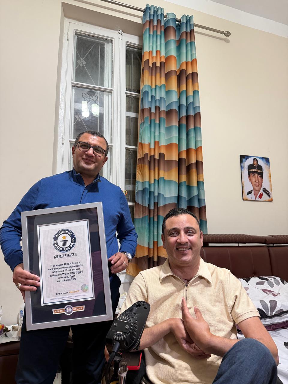 ونزل للماء وغاص، وكتب اسم مصر مرة أخرى في التاريخ؛ غطس 6 ساعات و4 دقائق و45 ثانية، محققاً رقماً عالمياً جديداً كأول رجل شلل رباعي يدخل موسوعة چينيس.