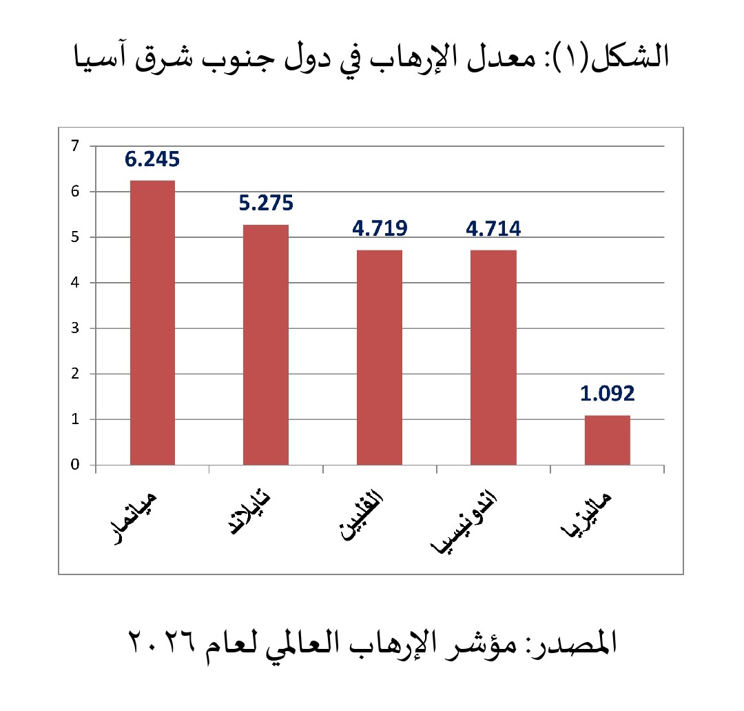 (-) معدل العمليات الإرهابية: أوضح مؤشر الإرهاب العالمي لعام 2026 الذي يوضحه الشكل(1) حجم الإرهاب في دول جنوب شرق آسيا، فما بين 6 إلى 8 يعتبر مؤشر مرتفع، وما بين 4 إلى 6 يعتبر مؤشر متوسط، أما بين صفر إلى 2 يعتبر منخفض جدًا، وبالتالي فدول جنوب شرق آسيا لا تتفق في معدلات الإرهاب داخلها، بل يرتفع بشكل كبير في ميانمار وتايلاند، حيث أن المؤشر 6.2 و 5.27 على التوالي، ثم يلي ذلك كل من الفلبين واندونيسيا، وتأتي ماليزيا في مستوى ارهاب منخفض جدًا بالنسبة لباقي الدول، حيث بلغ المؤشر داخلها 1.09.