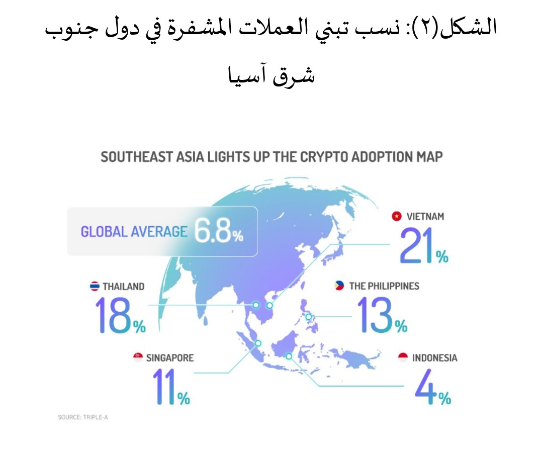 (-) الاعتماد على العملات المشفرة: قدرت شركة TRM تدفقات غير مشروعة للعملات المشفرة بقيمة قياسية بلغت 158 مليار دولار أمريكي في عام 2025، بارتفاع نسبته 145% عن عام 2024، وهو ما نتج عن قيام الجماعات الإرهابية في جنوب شرق آسيا بتكثيف استخدام العملات المشفرة كوسيلة لجمع الأموال وتحويلها؛ لتجنب الكشف عنها، خاصة أن منطقة جنوب شرق آسيا تضم أعداد كبيرة من مستخدمي العملات المشفرة، حيث يبلغ متوسط معدل استخدام العملات المشفرة في جنوب شرق آسيا نحو أكثر من 3.65%، بالإضافة إلى ذلك كشف تقرير صادر عن شركة الاستثمار الجريء “وايت ستار كابيتال” أن جنوب شرق آسيا موطن لـ 600 مقر رئيسي لشركات العملات المشفرة أو تقنية البلوك تشين، فكما يوضح الشكل (2) فجنوب شرق آسيا تُهيمن على خريطة العملات المشفرة العالمية،إذ يصل معدل التبني في فيتنام 21%، تليها تايلاند بنسبة 18%، ثم الفلبين بنسبة 13%، ثم سنغافورة بنسبة 11%، وهى نسب أعلى من المعدل العالمي الذي يبلغ 6.8%، وأخيرًا تأتي أندونيسيا بنسبة 4%، وهي نسبة كبيرة للغاية بالمقارنة بعدد السكان.
