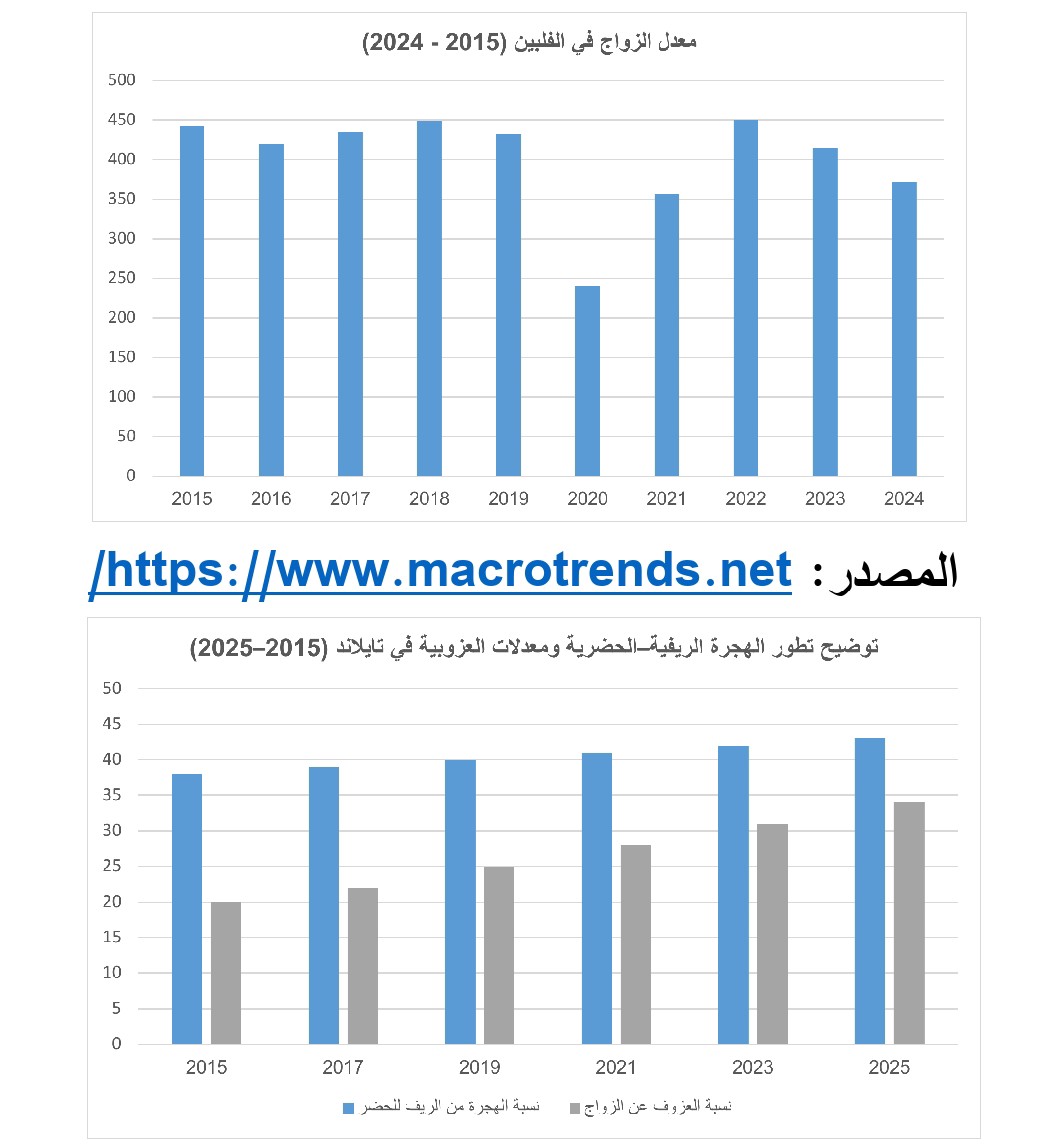 (-) وفي المقابل، تعكس فيتنام وتايلاند أنماط الزواج أثر التحولات البنيوية المرتبطة بالهجرة من الريف إلى المدن، حيث أسهمت هذه الهجرة في تفكك البنى الأسرية التقليدية وتراجع أنماط العيش الممتد وضعف الرقابة الاجتماعية على اختيارات الزواج. كما أدى انخراط النساء في سوق العمل الصناعي إلى إعادة تشكيل الأدوار وتأجيل الزواج. وفي تايلاند ارتبط ذلك بارتفاع نسبة غير المتزوجين في الأعمار المتقدمة بينما شهدت فيتنام أنماطًا أكثر اعتدالًا مثل تأخر الزواج. وبوجه عام، أسهمت هذه التحولات في إعادة تعريف العلاقة بين الفرد والأسرة، مما أدى إلى تراجع تدريجي في معدلات الزواج والإنجاب.