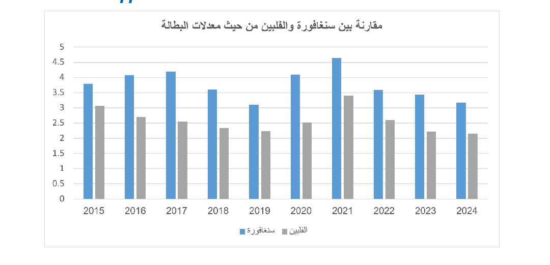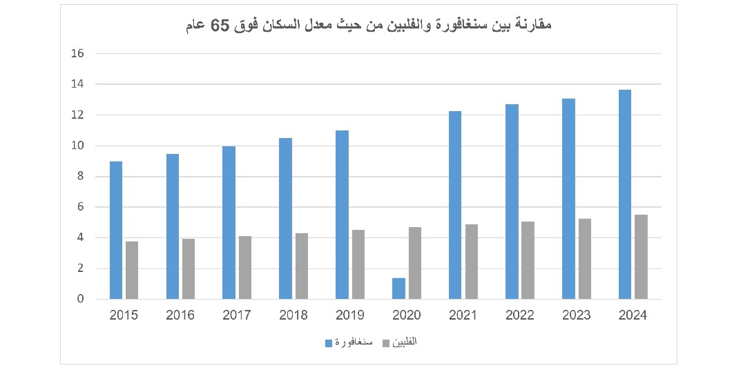 ومع استمرار هذا الاتجاه، يُعاد تشكيل البنية العمرية للسكان، حيث ترتفع نسبة كبار السن مقابل تقلص الفئات الشابة. ويظهر هذا الاتجاه بوضوح في دول مثل سنغافورة التي تشهد تأخرًا أكبر في الزواج، ما يسرّع الشيخوخة السكانية ويحوّلها إلى سمة بنيوية. في المقابل، ما تزال الفلبين تحتفظ بقاعدة سكانية أكثر شبابًا نسبيًا، غير أن الاتجاه العام في المنطقة يشير إلى اختلال متزايد في التوازن بين الأجيال، ولتوضيح انعكاسات هذا التحول على البنية العمرية، يمكن مقارنة معدل السكان فوق 65 عام بين سنغافورة والفلبين كما يوضح الشكل التالي: